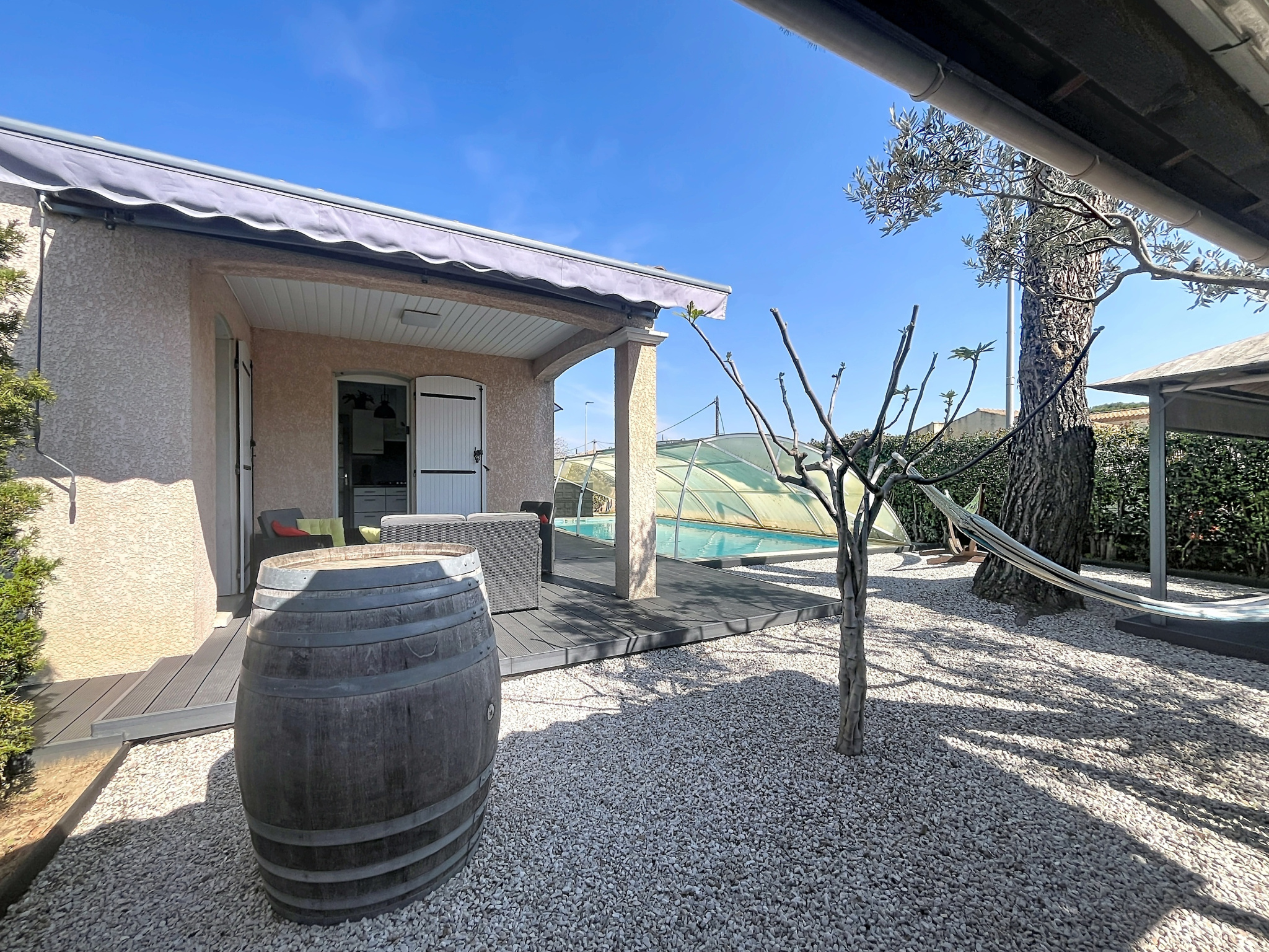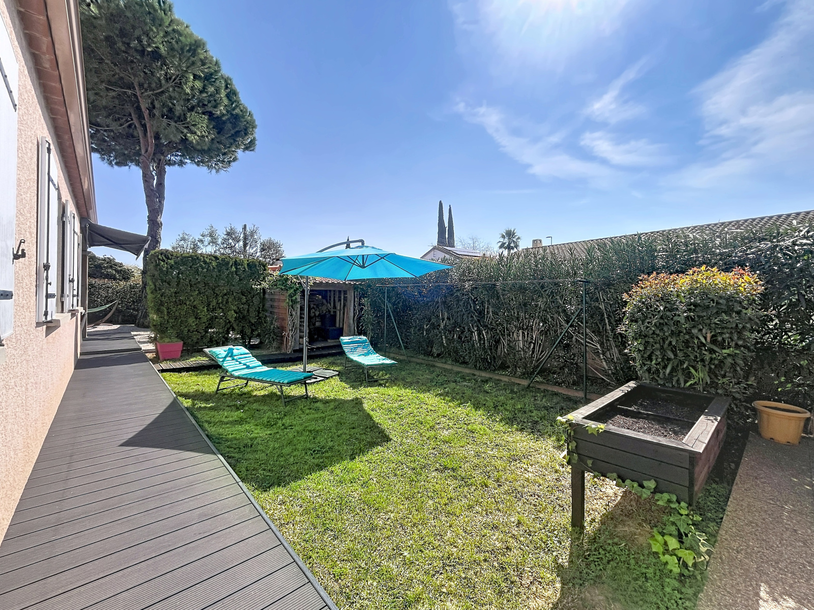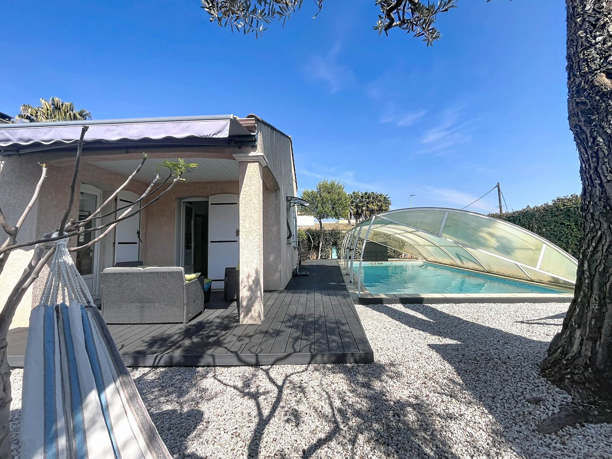 Dès l’entrée, vous serez séduit par ses espaces fonctionnels comprenant un placard et un WC indépendant. La pièce de vie, baignée de lumière, s’ouvre sur un agréable jardin arboré. La cuisine indépendante offre un accès direct à la terrasse et à la piscine, parfait pour profiter pleinement des beaux jours.